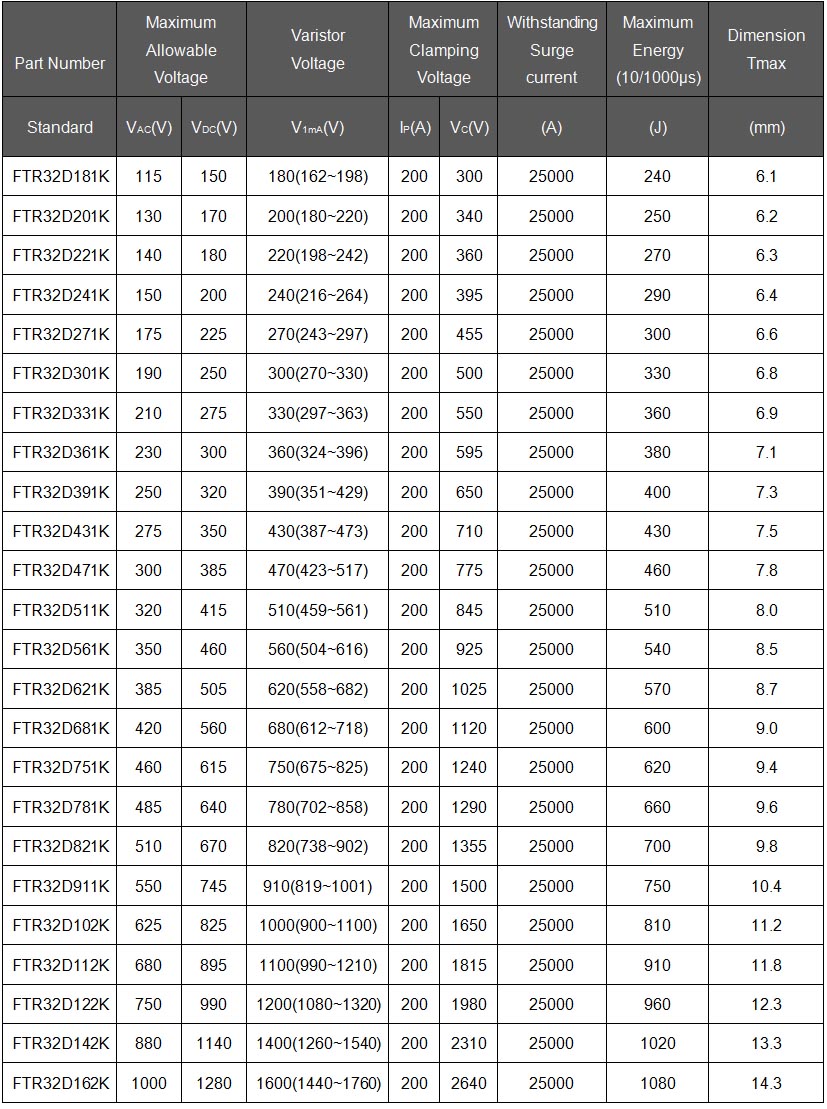 Varistor Voltage: 180 - 1600V